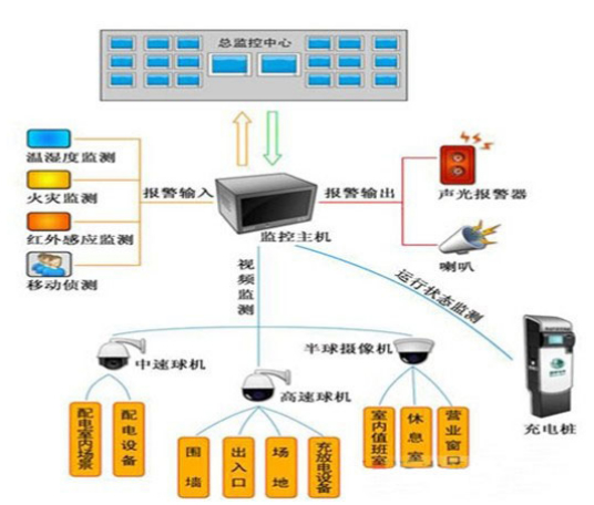 在充電站的供電區、充電區、電池更換區、營(yíng)業(yè)窗口等位置設置攝相機。安防監控系統與報警系統實(shí)現聯(lián)動(dòng),發(fā)生報警時(shí)自動(dòng)觸發(fā)錄像并彈出報警區攝相機的圖像,對監控視頻的來(lái)源,記錄的時(shí)間、日期和其它系統信息全部或有選擇性的保存,視頻信息質(zhì)量及保存時(shí)間滿(mǎn)足管理的需要。 在充電站供電區,監控室,電池維護區,電池存儲區等位置設置入侵控測器,實(shí)現全部或部分探測回路的布防及撤防。 具體布置示意如下: